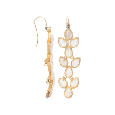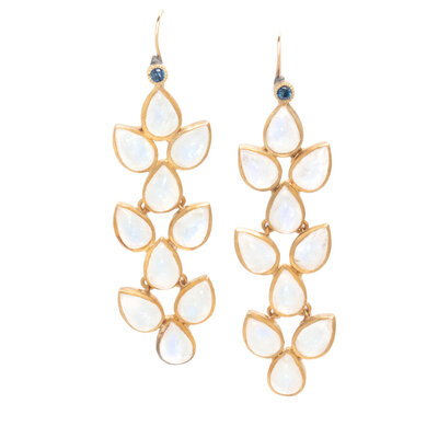 Pear shaped cabochon moonstones and round sapphires. Yellow gold. 2 1/2 inches long.