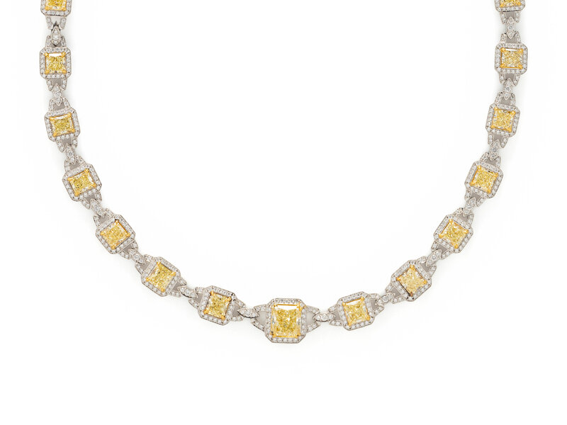 Cut-cornered rectangular modified brilliant cut Fancy Yellow diamond weighing 2.02 carats, cut-cornered square modified brilliant cut yellow diamonds (origin of color not tested) weighing approximately 13.80 carats total, and round diamonds weighing approximately 3.80 carats total. Platinum and yellow and white gold. 17 1/2 inches long.