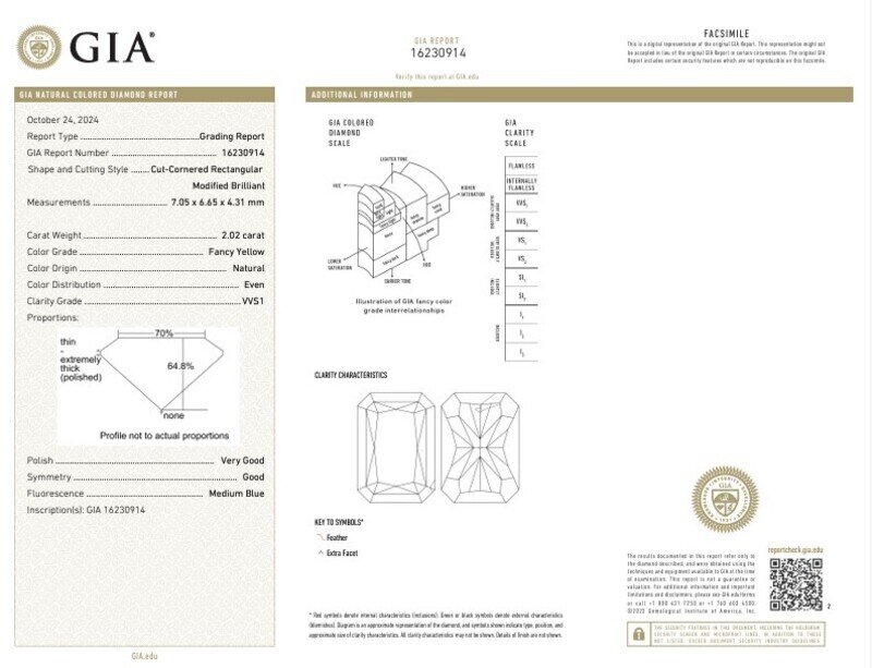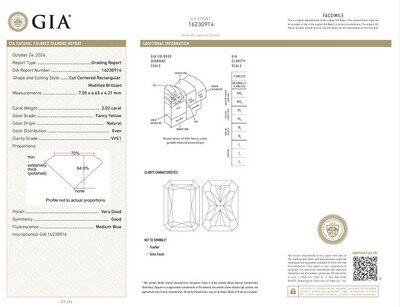 GIA, 2024, Report No. 16230914, 2.02 carats, Fancy Yellow color, Natural color, VVS1 clarity, Medium Blue fluorescence