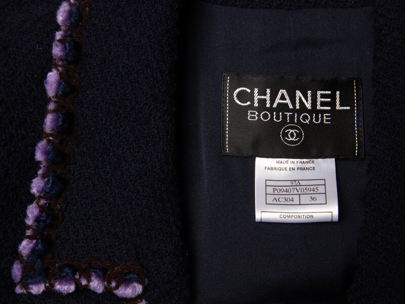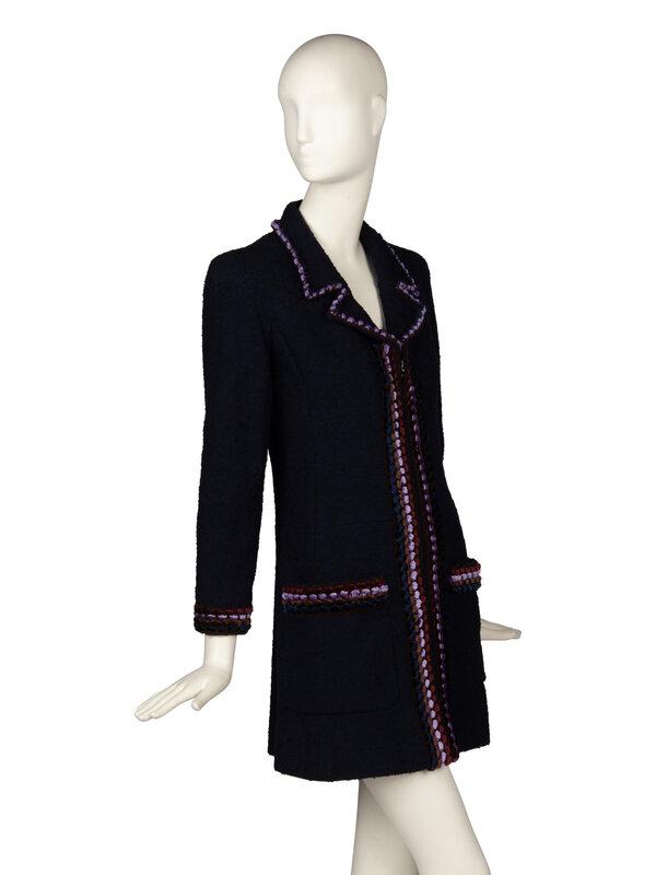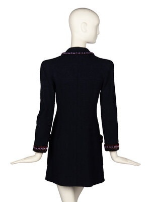 Tailored mini coat dress in navy wool/nylon-blend bouclé tweed with multicolor braided chenille trim throughout. Notch lapel collar. Wrist length sleeves. Padding at shoulders. Two large patch pockets at hips. Invisible zipper closure at front with metal CC logo zipper pull. 8.5" high slit at center front hem. Metal chain weight at hem interior. Fully lined in navy silk jacquard.