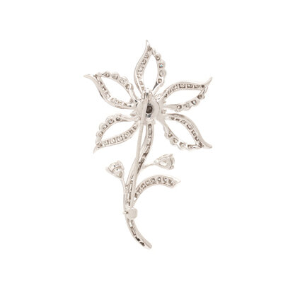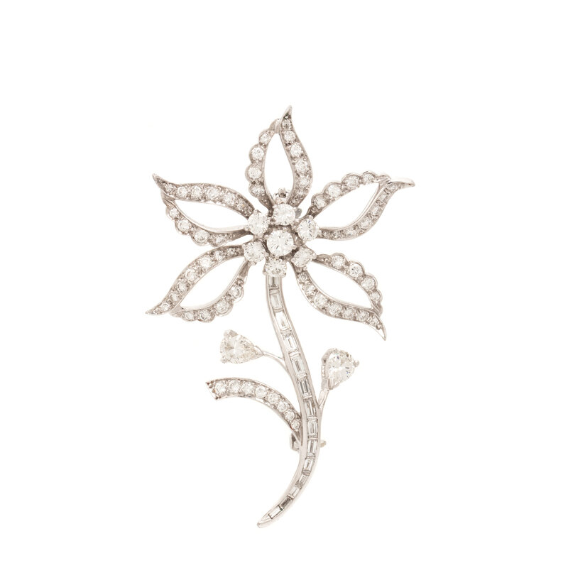 Designed as a flower, set throughout with round, baguette, and pear shaped diamonds weighing approximately 3.00 carats total. Mounted in platinum. 2 x 1 1/4 inches.