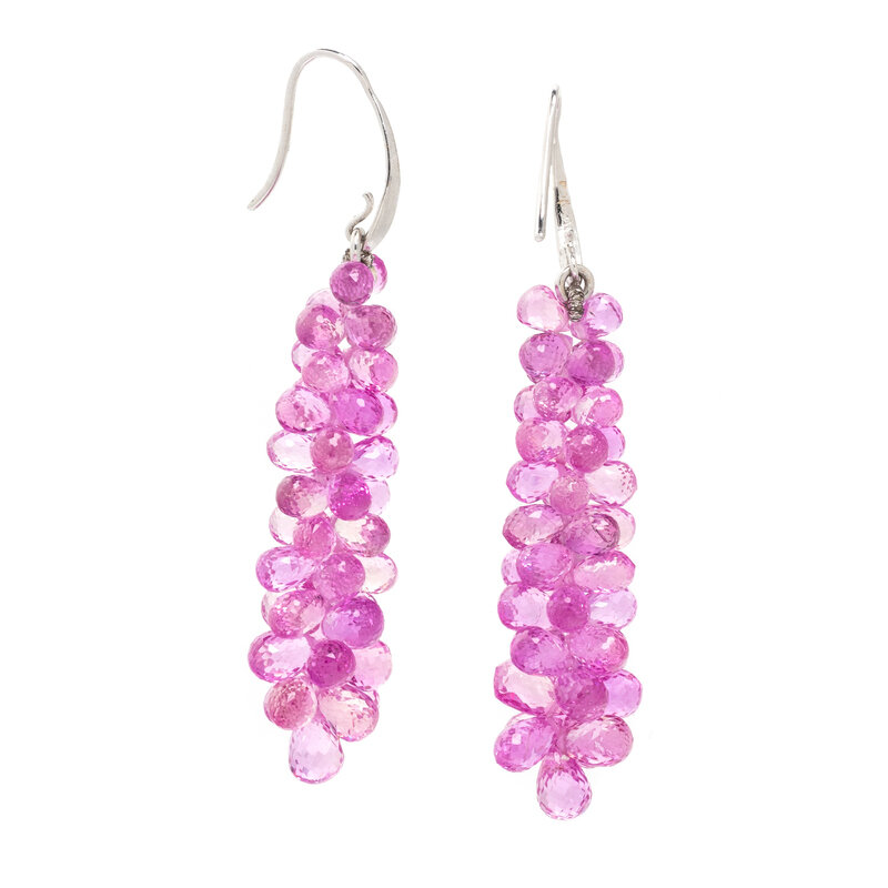 Designed as a cascade of pink sapphire briolettes suspended from white gold wires. 18 karat white gold. 2 inches long.