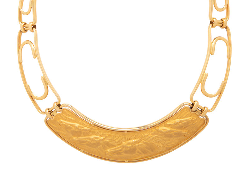 Consisting of a curved plaque of matte and polished gold relief horses, within a graduated fancy link necklace. 18 karat yellow gold. 15 1/2 inches inner circumference, 1 inch at widest.