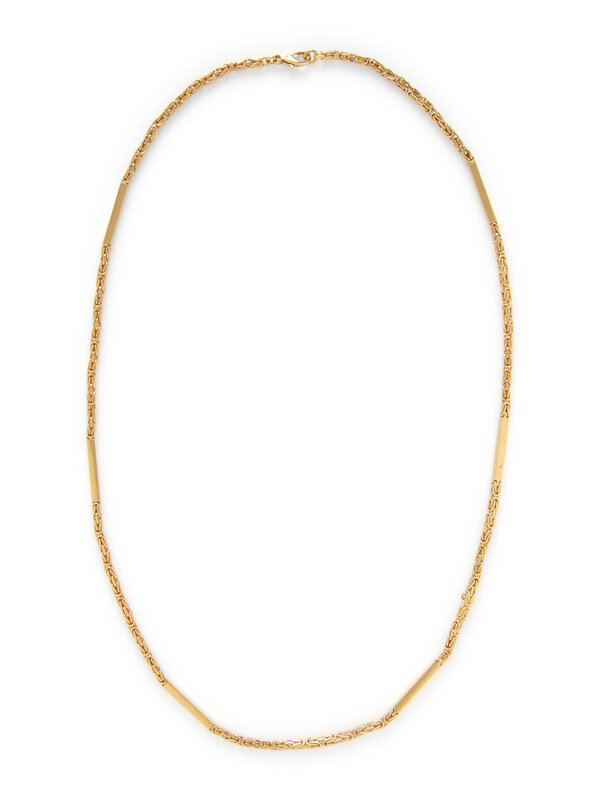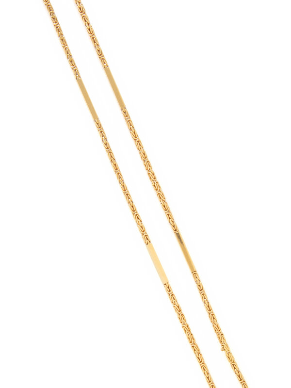 Consisting of a Byzantine link chain interspersed with six rectangular links measuring approximately 3.50 mm. 18 karat yellow gold. 28 1/2 inches long.