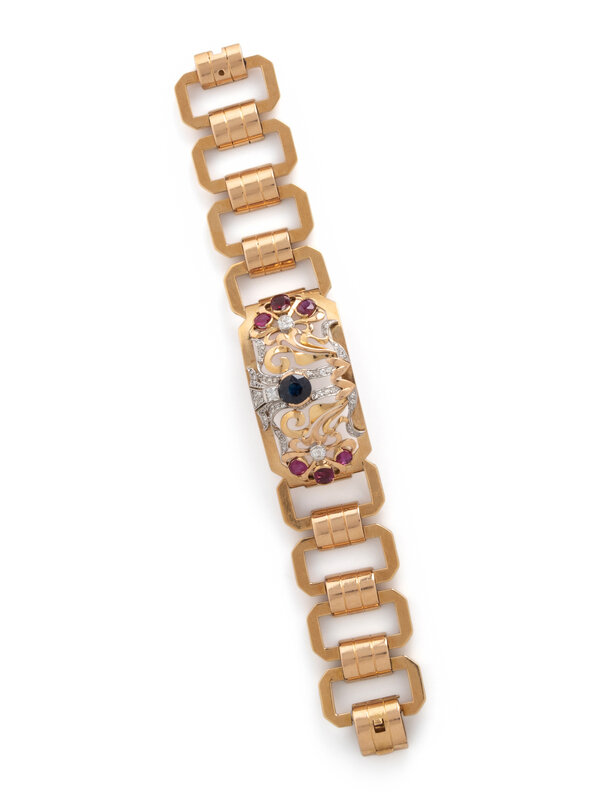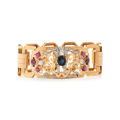 Consisting of yellow gold rectangular links with openwork central plaque set with a round faceted sapphire weighing approximately 2.20 carats by formula, oval rubies, French, old European, and single cut diamonds. Yellow gold and platinum. 7 1/2 inches long, 1 1/8 inches wide.