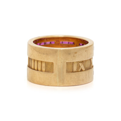 Designed with a central row of Roman numerals flanked by channel set rubies. 18 karat yellow gold. Ring size 6 1/2.