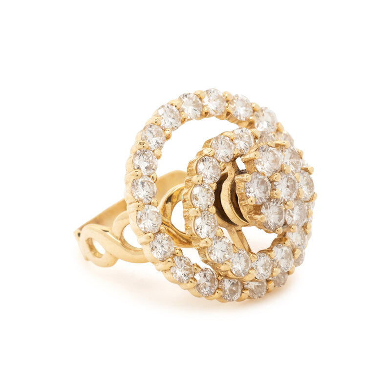 Designed as a central cluster of round diamonds, with two tiered revolving acentric circles of round diamonds weighing approximately 4.75 carats total, mounted on a yellow gold band. Ring size 7.