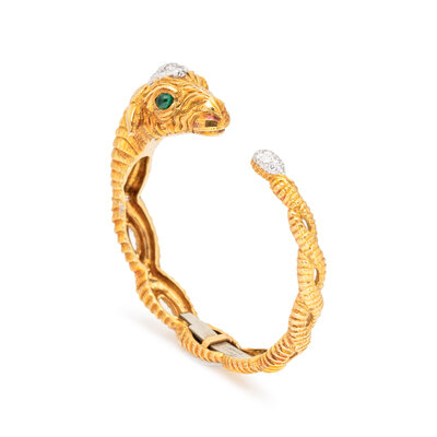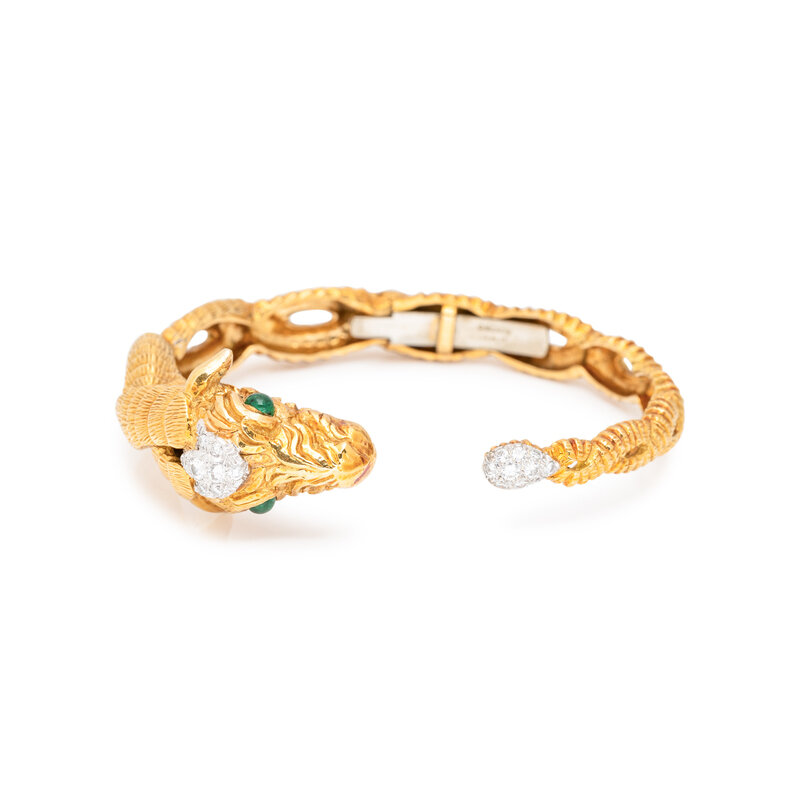 DAVID WEBB, YELLOW GOLD, DIAMOND AND EMERALD CAPRICORN CUFF BRACELET
