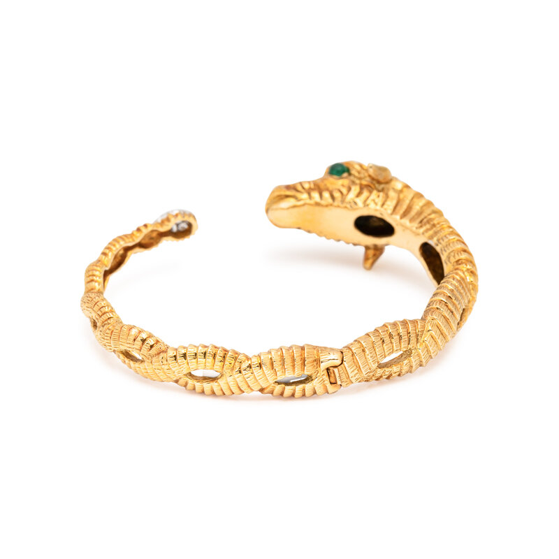 Set with round diamonds and cabochon emerald eyes, hinged at the back. 18 karat yellow gold and platinum. 6 1/4 inches inner circumference.