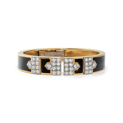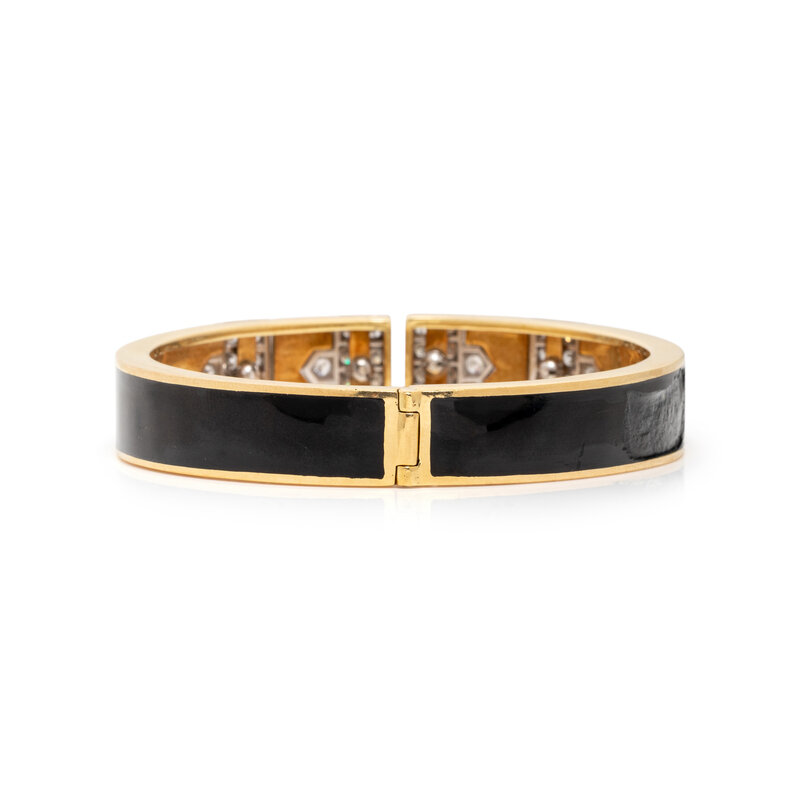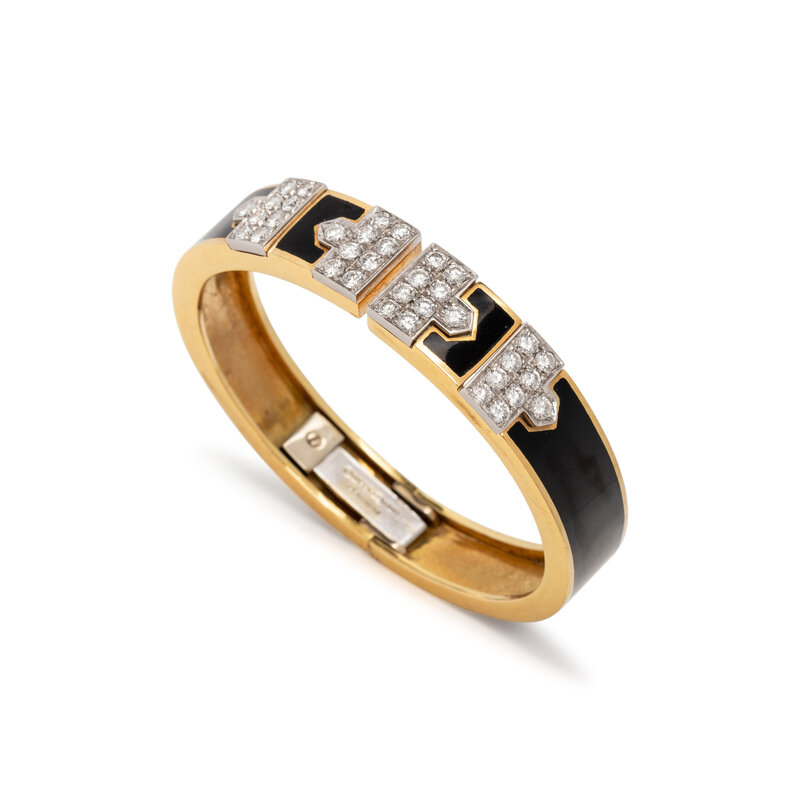 From the 'Manhattan Minimalism' collection, featuring black enamel and round diamonds weighing approximately 2.50 carats total, hinged at the back. Mounted in 18 karat yellow gold and platinum. 6 1/4 inches inner circumference.