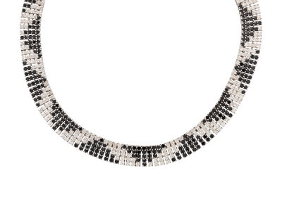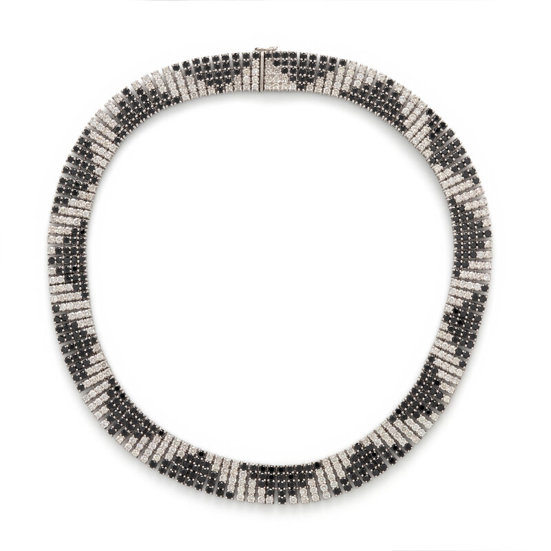 Consisting of five rows of round diamonds and black diamonds (origin of color not tested), white diamonds weighing approximately 12.00 carats total, black diamonds (origin of color not tested) weighing approximately 18.75 carats total, in a geometric design. 18 karat white gold. 16 inches long, 1 /2 inch wide.