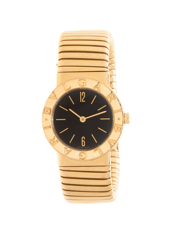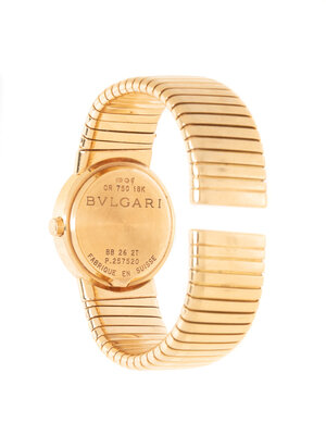 Stamps: Case back: BVLGARI 750 (Swiss hallmark) OR 750 18K BB 26 2T P.257520 FABRIQUE EN SUISSE. Bracelet: BVLGARI 750 (Italian hallmark).