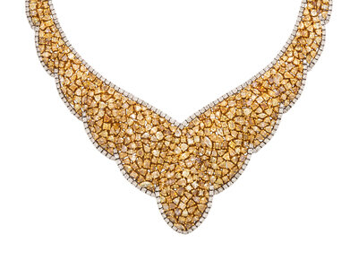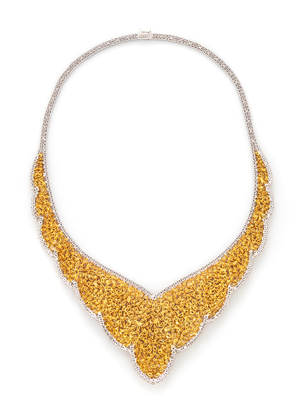 In a flexible bib design, set with variously shaped colored diamonds (origin of color not tested) weighing approximately 45.85 carats total, within a border of round diamonds weighing approximately 12.40 carats total. Mounted in 18 karat yellow and white gold. 17 1/4 inches long.