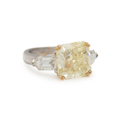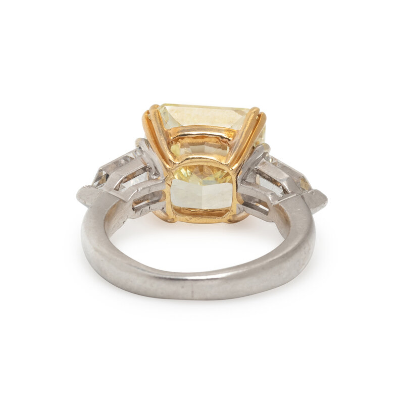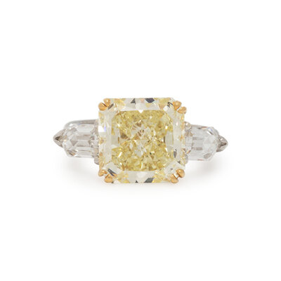 Centering a radiant cut fancy yellow diamond weighing 8.88 carats, with two bullet cut diamonds weighing approximately 2.00 carats total. Mounted in platinum and 18 karat yellow. Ring size 7 1/2.