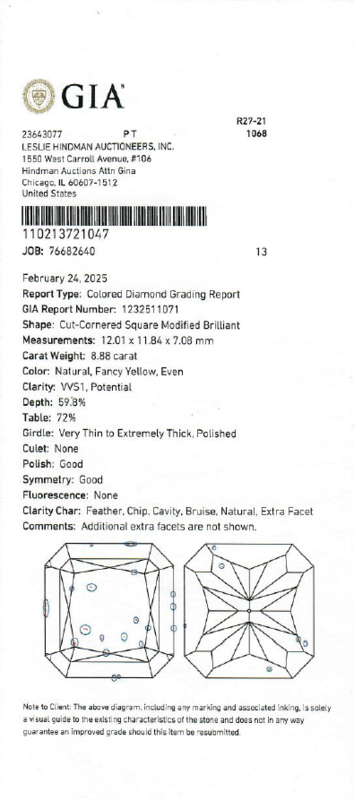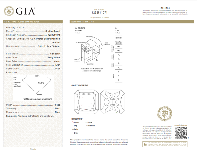 GIA, 2025, Report No. 1232511071, 8.88 carats, Fancy Yellow color, VVS1 clarity