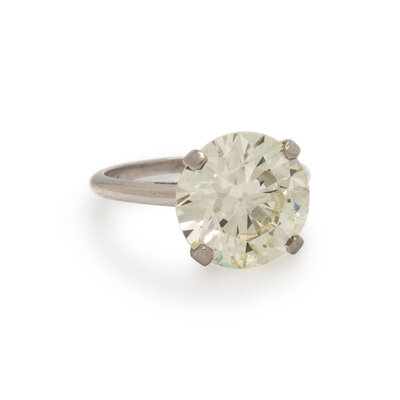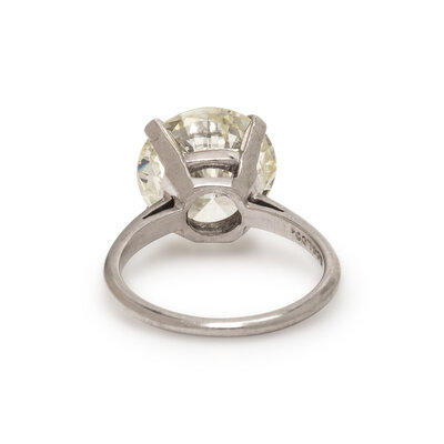 Featuring a round brilliant cut diamond weighing 5.19 carats. Mounted in platinum. Ring size 5 1/2.