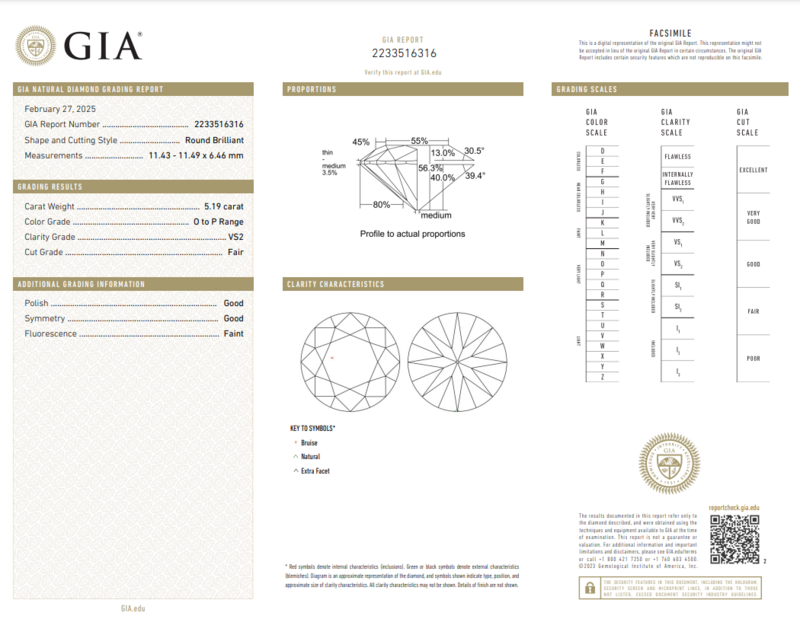 GIA, 2025, Report No. 2233516316, 5.19 carats, O-P color, VS2 clarity, Faint fluorescence