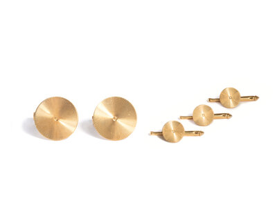 Cufflinks and three shirt studs. Yellow gold. Cufflinks: 3/4 inch wide. Studs: 3/8 inch wide.