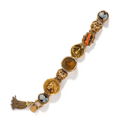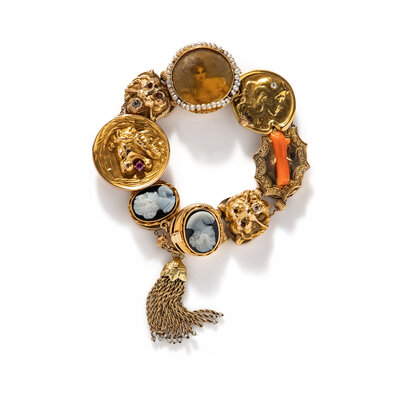 Eight charms including two onyx cameos, a miniature with seed pearls, coral, two lion charms with garnet eyes and old European cut diamonds, and one lion slide set with a round ruby. Yellow gold. 7 1/2 inches long.
