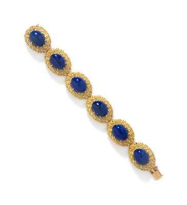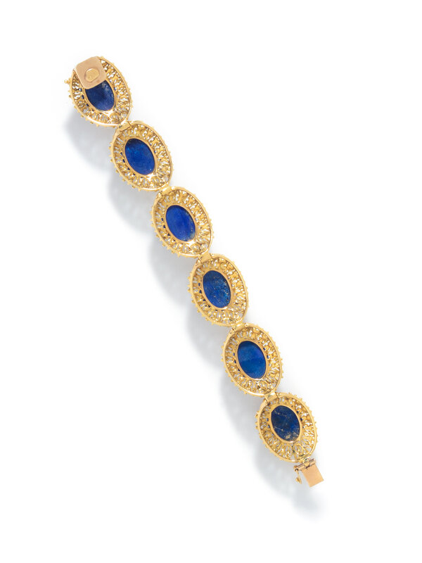 Oval cabochon lapis lazuli. 18 karat yellow gold. 6 1/2 inches long, 3/4 inch wide.
