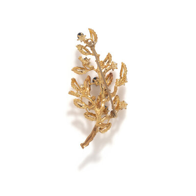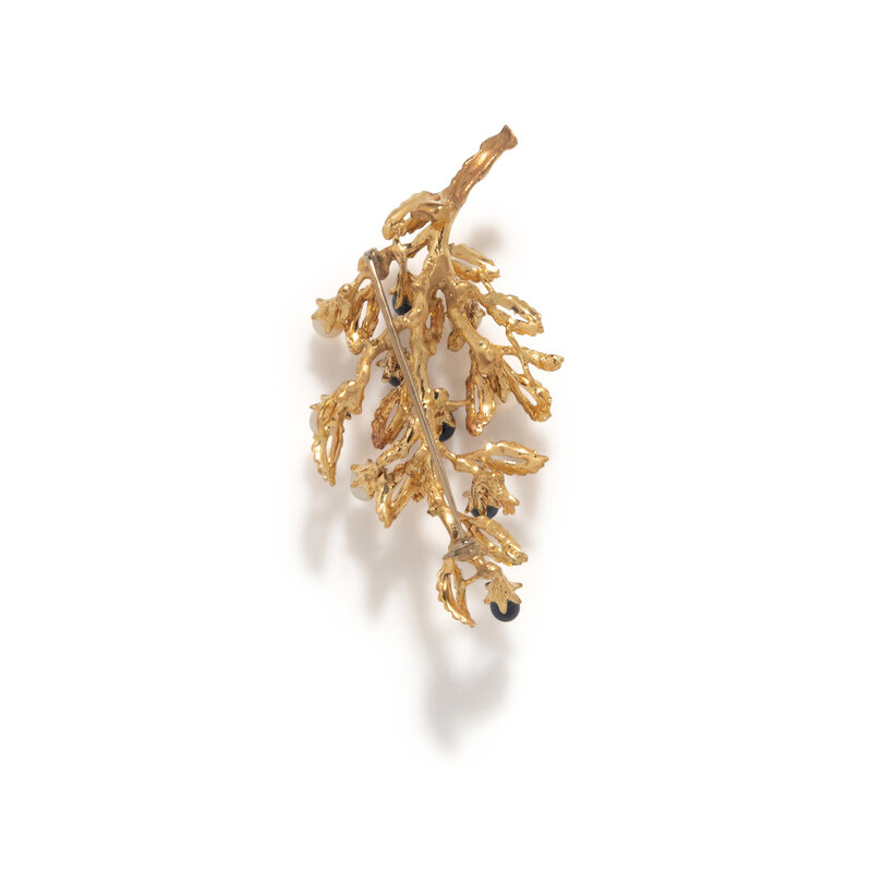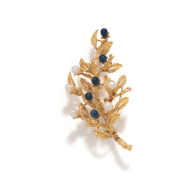 LAPIS LAZULI, CULTURED PEARL, AND YELLOW GOLD FOLIATE BROOCH