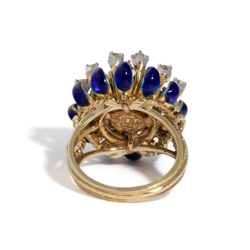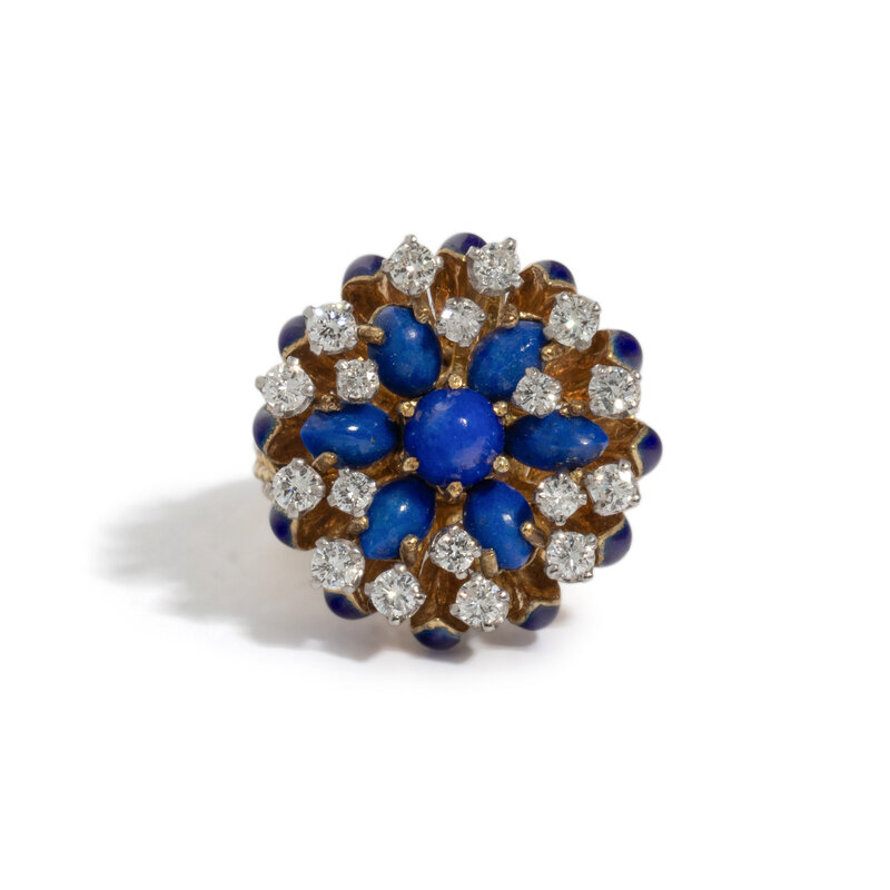 Round diamonds weighing approximately 0.70 carat total, cabochon lapis lazuli, and blue enamel. 14 karat yellow gold. Ring size 6 1/2.