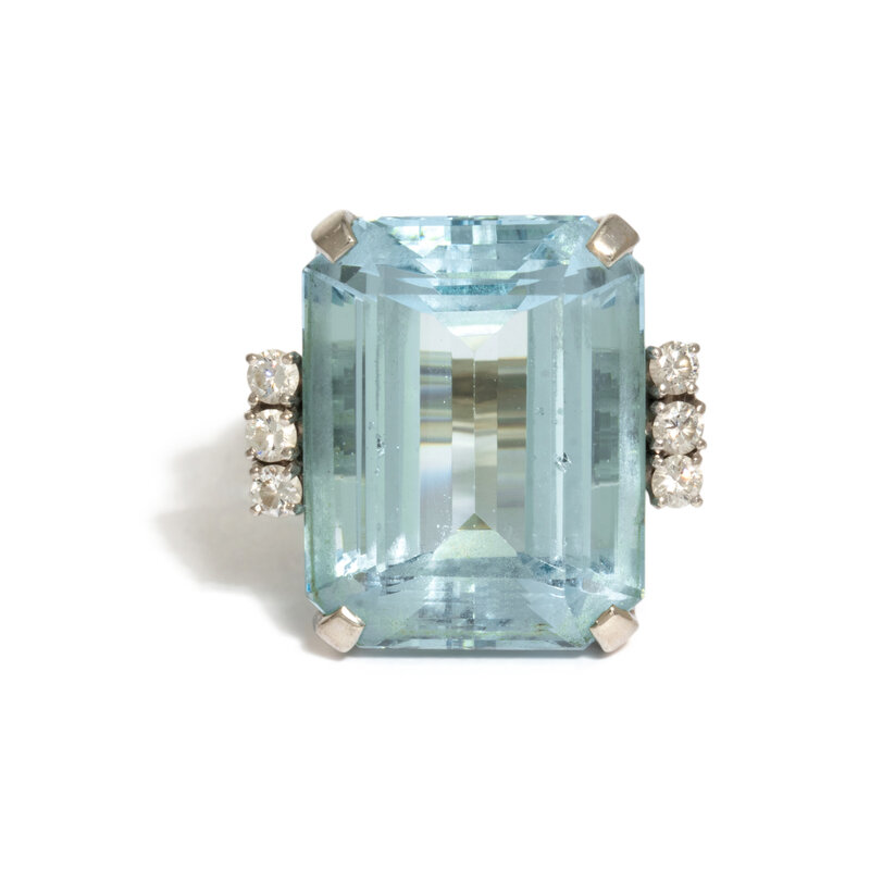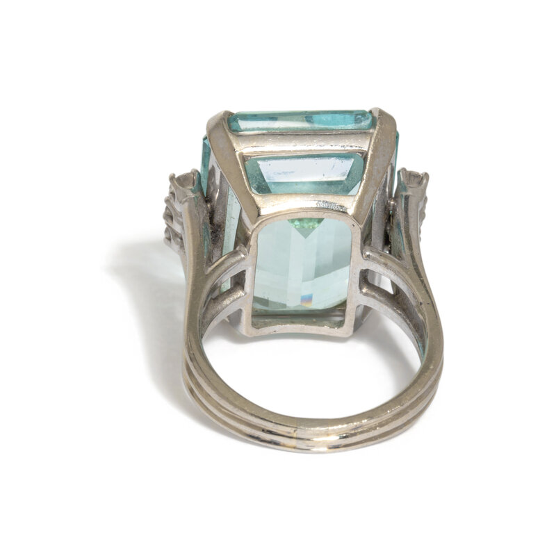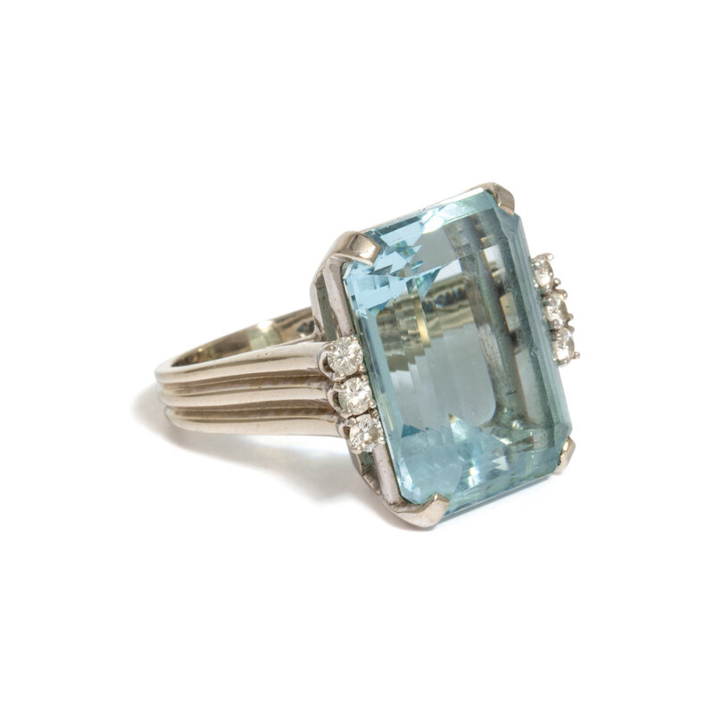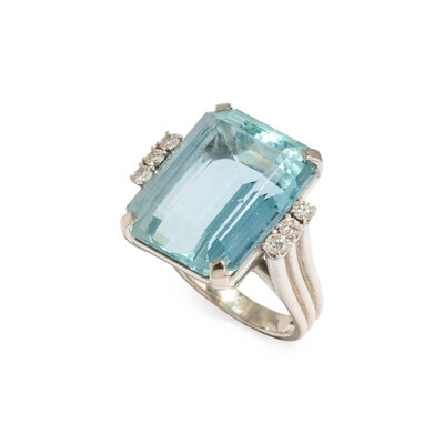 Emerald cut aquamarine weighing approximately 20.00 carats by formula, and round diamonds. 14 karat white gold. Ring size 7.