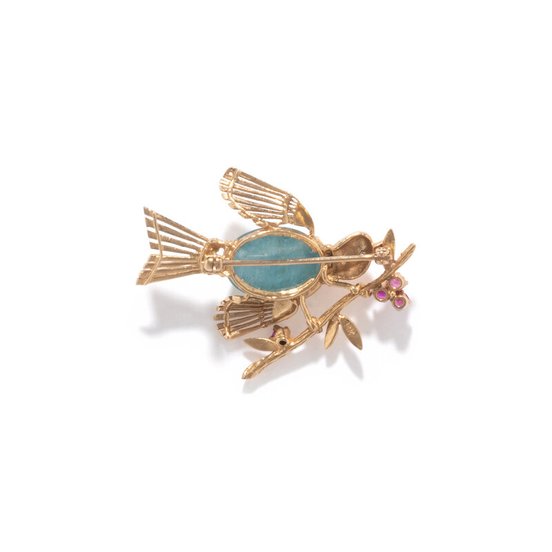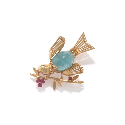 AQUAMARINE, RUBY, AND DIAMOND BIRD BROOCH