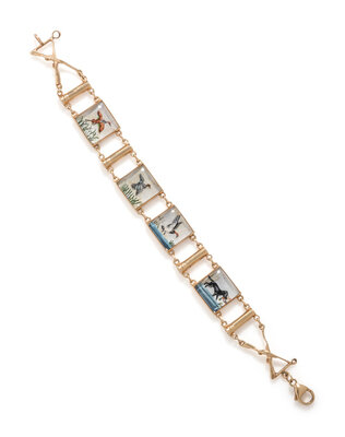 Reverse cut and painted Essex crystals depicting birds and a dog against mother-of-pearl backings. 14 karat yellow gold. 7 inches long.