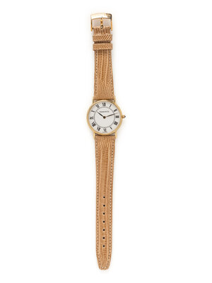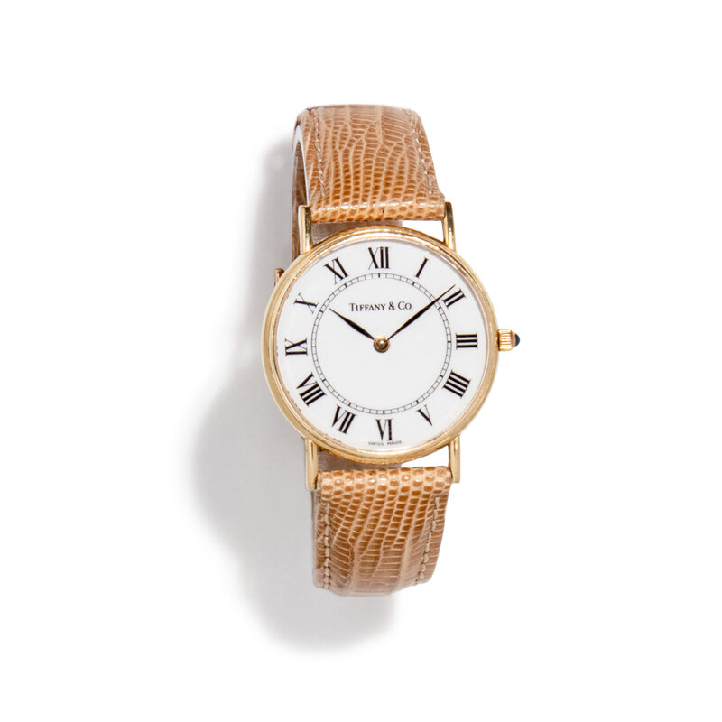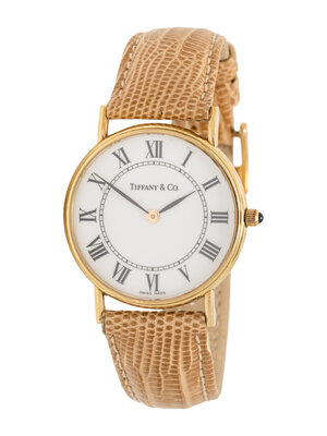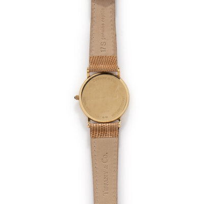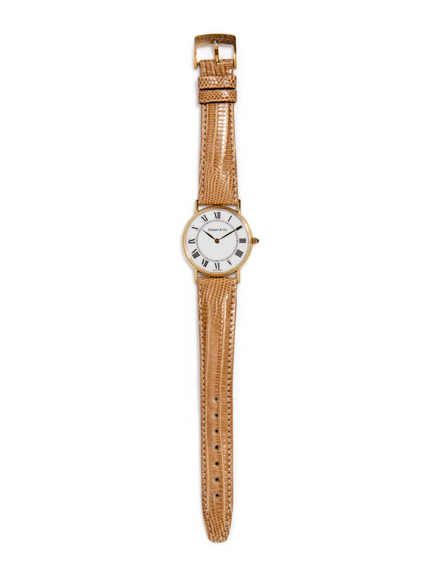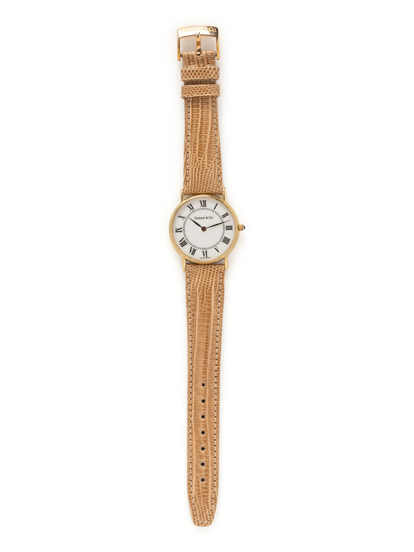 Bracelet/Strap: Tan leather signed Tiffany & Co. with T&Co. buckle