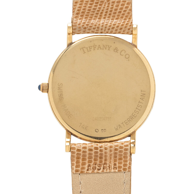 Stamps: Case back: TIFFANY & CO. SWISS MADE 14K 040214731 WATER RESISTANT 585 (Swiss hallmark). Clasp: TIFFANY & CO.