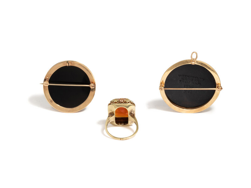 A Wedgewood cameo pendant/brooch, an onyx cameo brooch, and a carnelian intaglio ring with seed pearl surround. Yellow and rose gold. Brooches: 1 1/4 inches and 1 1/2 inches wide. Ring size 7 3/4.