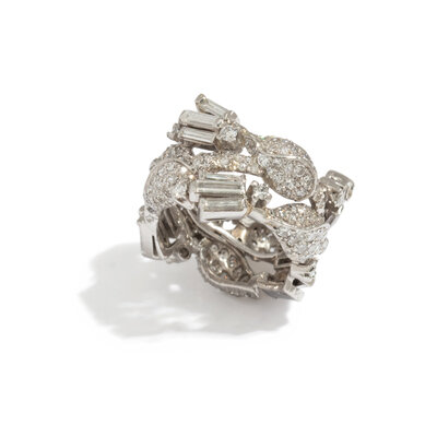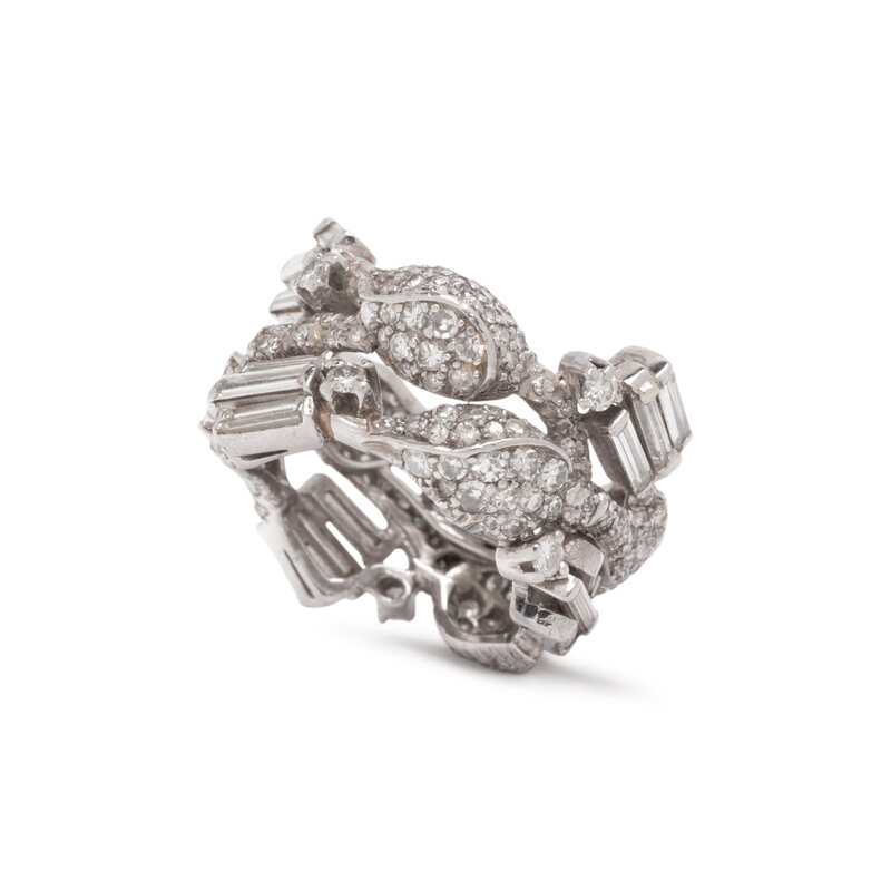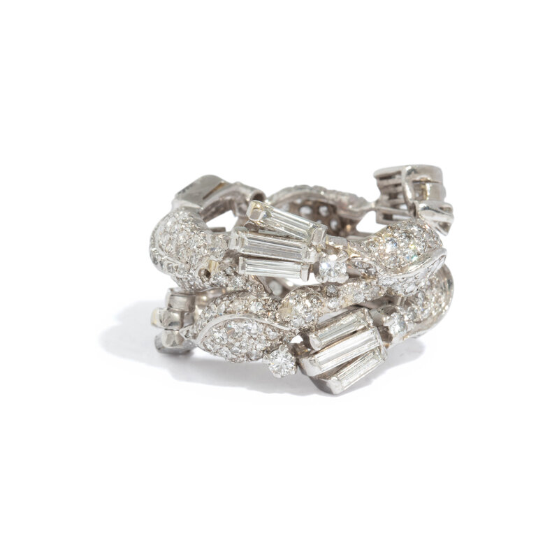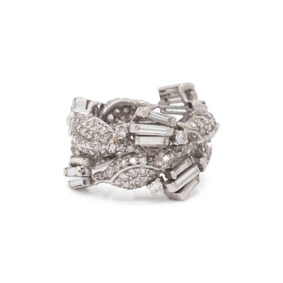 Round, baguette, and single cut diamonds weighing approximately 3.00 - 3.50 carats total. Platinum. Ring size 5.