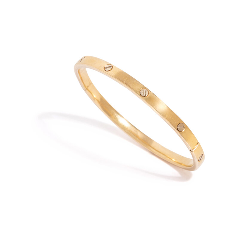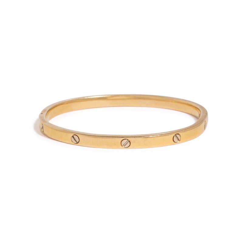 Hinged with side clasp. 18 karat yellow gold. 7 inches inner circumference.