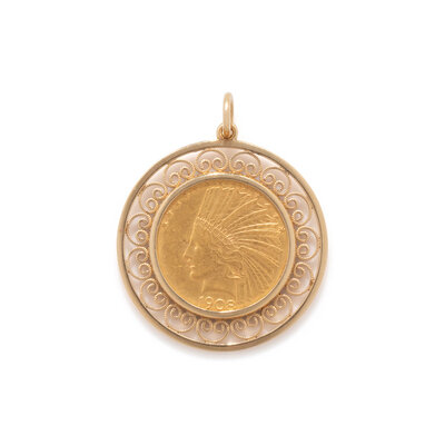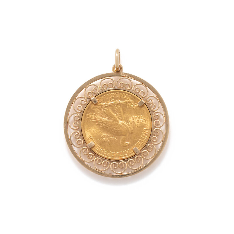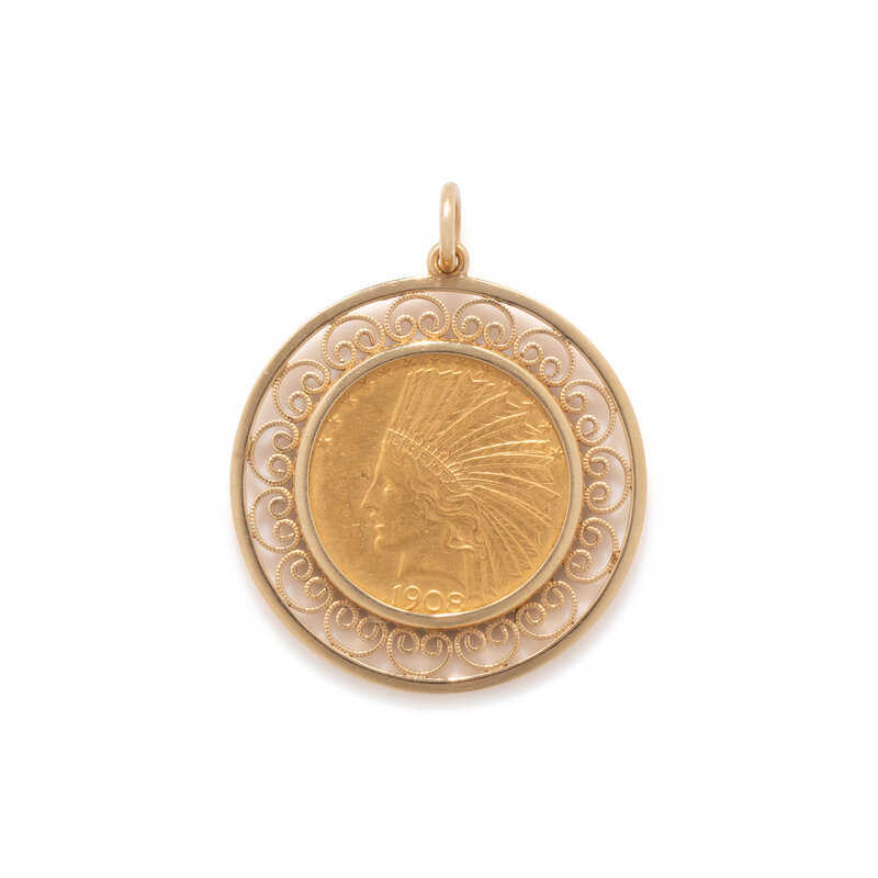 U.S. $10 coin dated 1908, mounted in 14 karat gold. 1 1/2 inches wide.