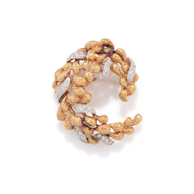 Round diamonds. 18 karat yellow and white gold. 1 3/4 x 1 1/2 inches.