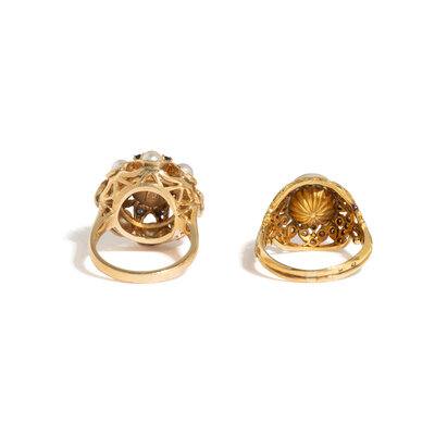 TWO YELLOW GOLD AND CULTURED PEARL RINGS