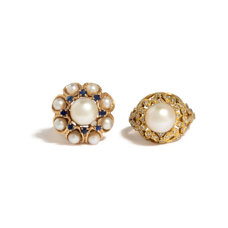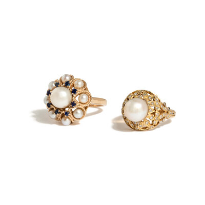 Variously set with cultured pearls, single cut diamonds, and round faceted blue glass. Yellow gold. Ring sizes 6 3/4 and 7 3/4.