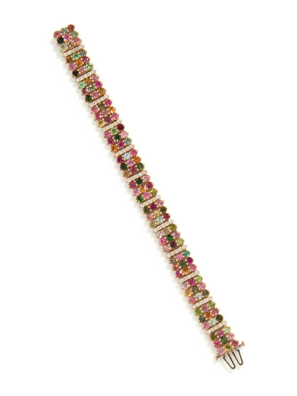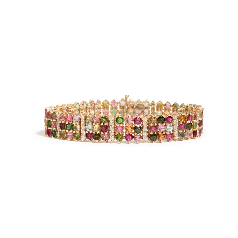 Round pink tourmaline, green tourmaline, garnet, and citrine, and round diamonds weighing approximately 1.75 carats total. 14 karat yellow gold. 7 1/2 inches long.