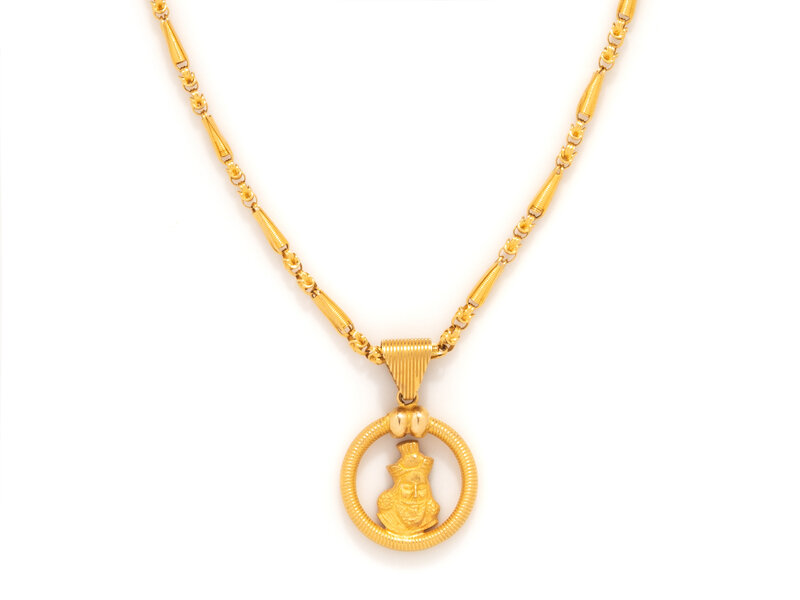 18 karat yellow gold. Chain: 16 1/4 inches long. Pendant: 1 1/4 inches long.