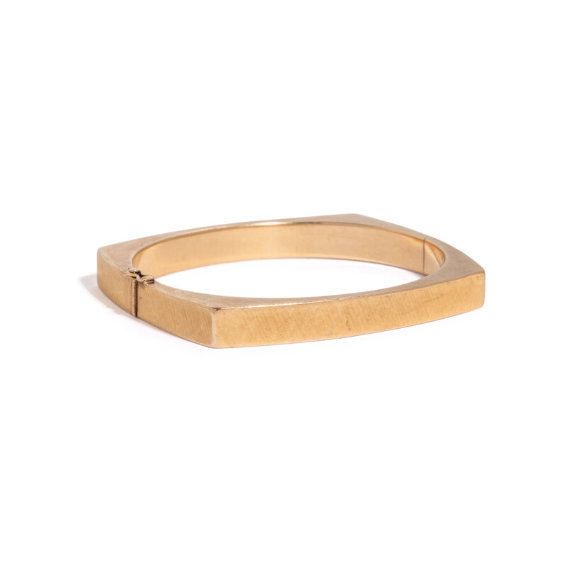 Hinged with side clasp. 14 karat yellow gold. 7 inches inner circumference.