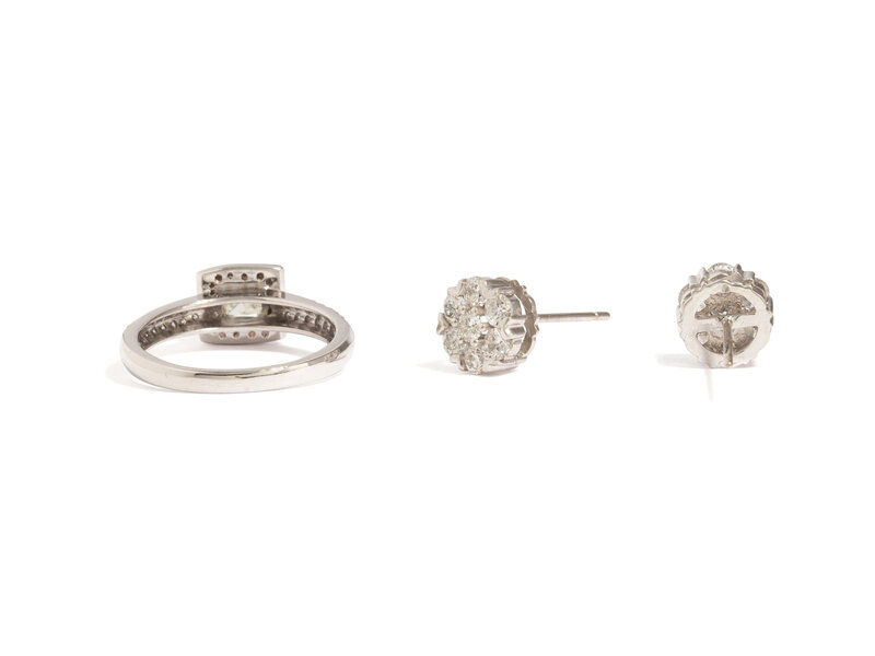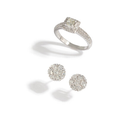 Ring set with one princess cut diamond and round diamonds weighing approximately 0.60 carat total, and earrings set with round diamonds weighing approximately 1.50 carats total. White gold. Ring size: 7. Earrings: 8.00 mm wide.