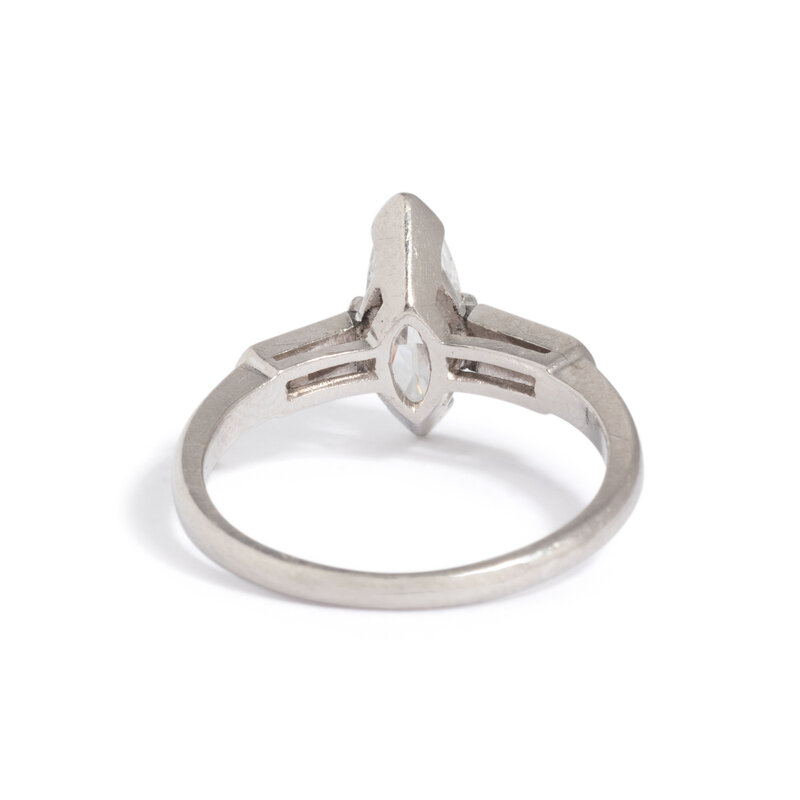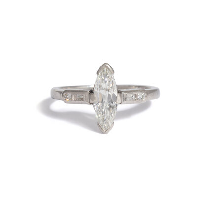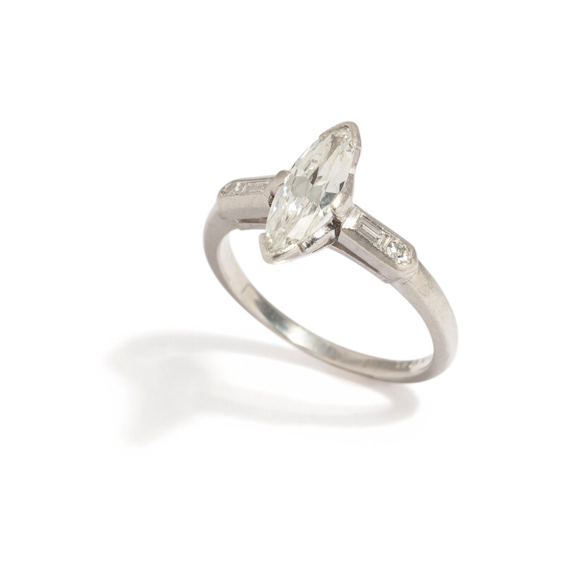 Marquise cut diamond weighing approximately 0.60 carat, and baguette and single cut accent diamonds. Platinum. Ring size 4 1/4.