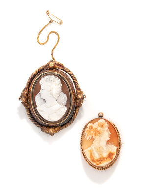 Two shell cameos. Yellow gold and low karat gold. 2 1/4 x 1 5/8 inches and 3 x 2 3/4 inches.