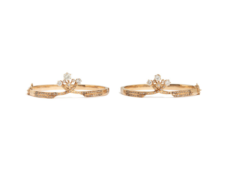 Round brilliant, single, rose, and antique cut diamonds weighing approximately 2.25 carats total, hinged with side clasp. Yellow gold. 6 1/2 inches inner circumference.