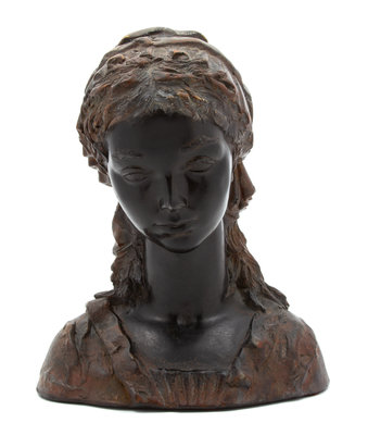 A Continental Black and Brown Glazed Ceramic Bust of Young Maiden