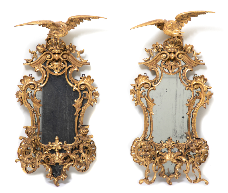 A Pair of George II Style Carved Giltwood Two-Light Mirrored Sconces