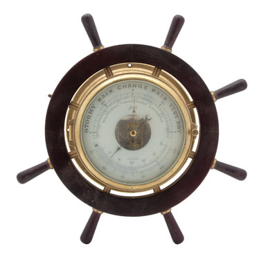 A Brass Cased and Mahogany Ship's Wheel Style Barometer