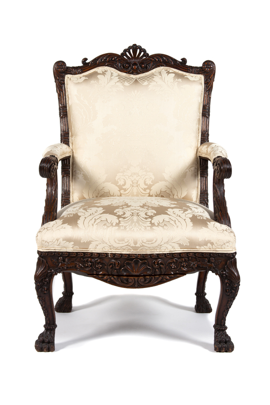A George I Style Carved Mahogany Upholstered Open Armchair
