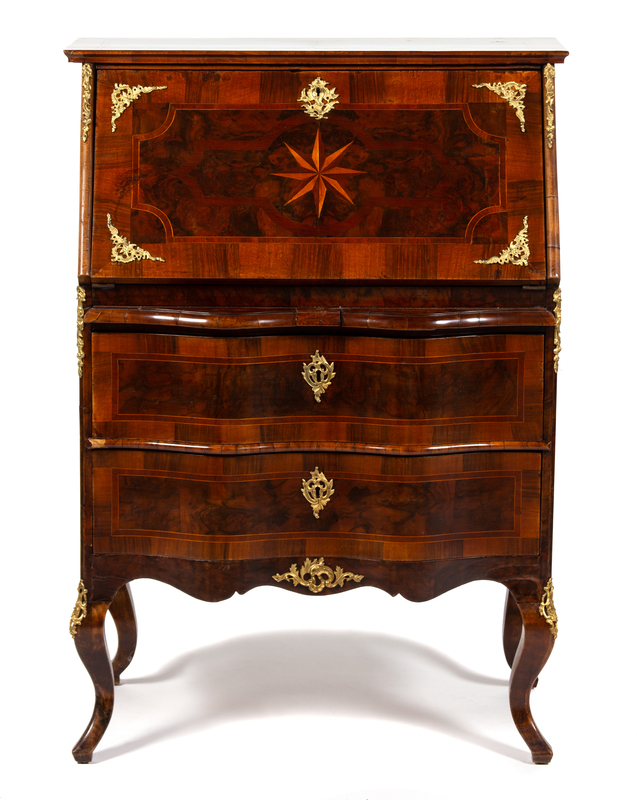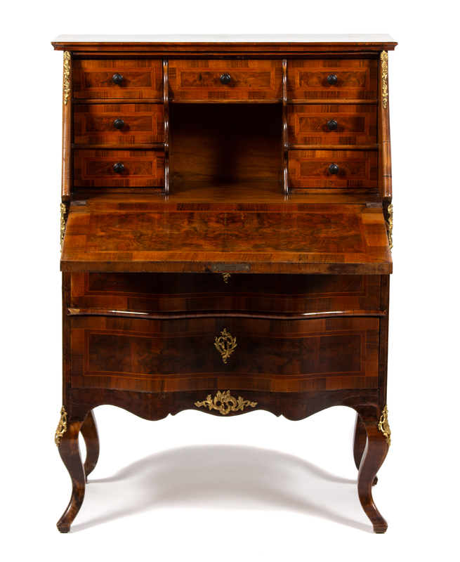 A Continental Rococo Style Gilt Bronze Mounted Inlaid Walnut Drop Front Desk